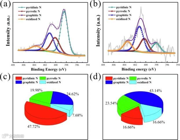 图2. Fe-pyridinic N-C, Fe-N-C的高分辨率 XPS N1s 光谱和吡啶N、吡咯N、石墨N 和氧化N 的含量。