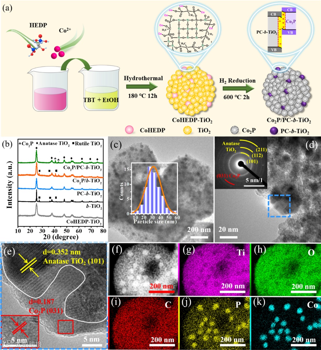 材料合成中,凭借着有机膦酸独特的螯合作用,CoHEDP可以与Ti前驱体均匀络合,经过水热反应后形成CoHEDP-TiO2。随后的氢气还原不仅促进了Co2P颗粒嵌入b-TiO2也将过量的有机膦酸配体转化为P、C掺杂剂。这种简单的一锅法可以促进具有均匀分散性和紧密锚固结构的P、C共掺杂Co2P/b-TiO2异质结催化剂的原位形成。XRD分析证明P掺杂可以抑制由高温造成的锐钛矿向金红石的相变。