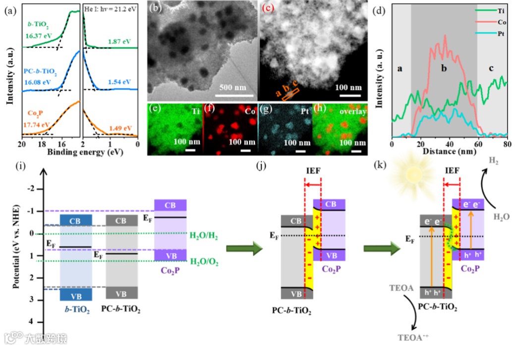 然后,电子自发地从高费米能级的Co2P转移至低费米能级的PC-b-TiO2直到费米能级平衡。由于Co2P捐献了电子所以靠近Co2P的界面区域带正电,而接收电子的PC-b-TiO2界面区域带负电,这就形成了由PC-b-TiO2指向Co2P的内建电场。同时界面区域的电子交换也导致能带弯曲,这可以阻止电子持续从Co2P流向PC-b-TiO2。