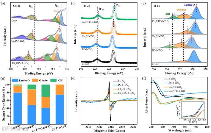 XPS和ZETA电位分析证明了电子从Co2P转移至b-TiO2,在二者之间形成了内建电场。而且P、C掺杂剂的引入可以增大二者之间的电位差,增大了电子转移数量。P、C掺杂剂分别以P-O和C-Ti-O的形式存在于Co2P/PC-b-TiO2中。进一步结合ESR, UV-vis,VB-XPS等一些列表征证明P、C掺杂剂填补了b-TiO2体相氧缺陷并增加了表面活性氧缺陷,而且调整能带结构,改善了吸光性能。