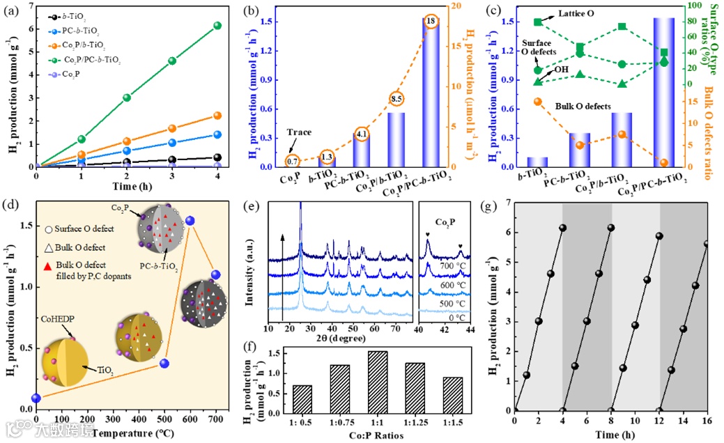 在光催化过程中,Co2P价带中的光生空穴和PC-b-TiO2光生电子会在电场力、库仑力和弯曲能带的共同作用下结合,促进了具有最佳氧化还原电位的Co2P导带中的光生电子和PC-b-TiO2价带中的光生空穴空间分离。最后,集丰富的电子、低导带位置和高内在催化活性于一身的Co2P能够高效地活化水分子释放氢气。