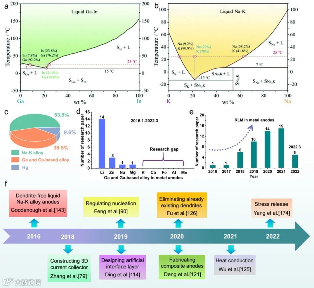 图2. (a)镓铟合金的相图。(b)钠钾合金的相图。(c)不同种类的室温液态金属在金属负极中的应用比例。(d)镓基液态金属在金属负极中的应用情况。(e)室温液态金属在金属负极中的应用发展趋势。(f)室温液态金属在金属负极中的应用发展历程