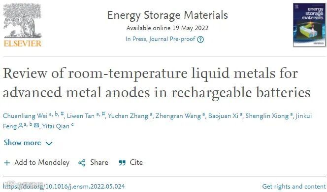 本文中,山东大学材料科学与工程学院的冯金奎教授课题组在国际知名期刊Energy Storage Materials上发表了题为“Review of room-temperature liquid metals for advanced metal anodes in rechargeable batteries”的综述文章,系统总结和分析了近年来室温液态金属在金属负极中研究进展。
