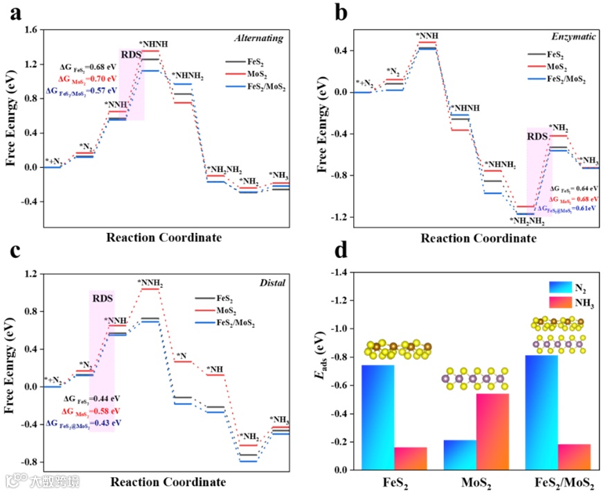 图7. FeS2/MoS2,FeS2和MoS2反应路径分析及氮气吸附能比较