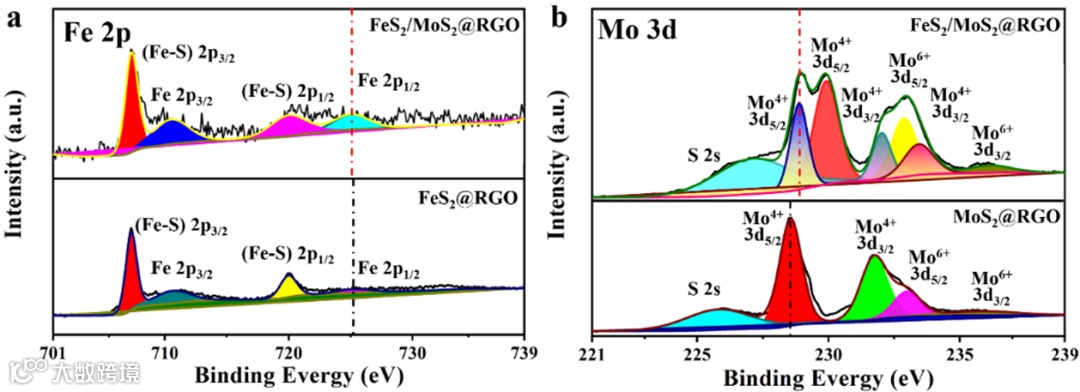 图3. FeS2/MoS2@RGO,FeS2@RGO和MoS2@RGO中Fe 2p和Mo 3d的XPS光谱图