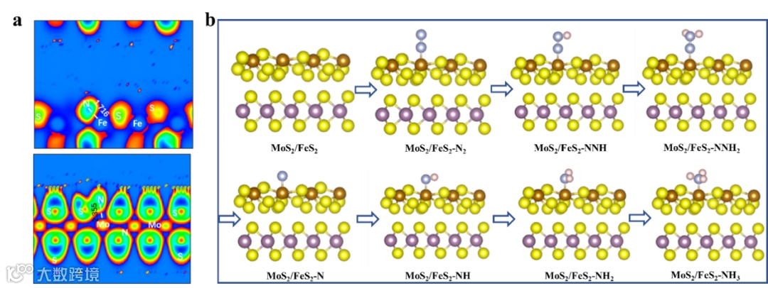 图8. FeS2/MoS2电子定域函数图及表面催化氮气还原结构图