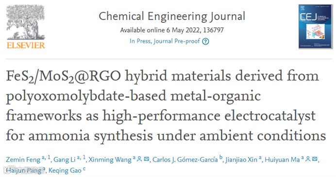 多酸基金属-有机框架衍生FeS2/MoS2@RGO杂化材料作为环境条件下合成氨的高性能电催化剂