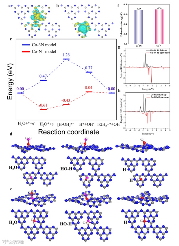 图3. Co-C3N4/rGO 的DFT计算建模和催化活性起源原理。(a)Co-N3的电荷密度差异结构。(b)Co-N1的电荷密度差异结构。(c)Co-N和 Co-3N 模型的相对能量分布。(d)Co-N模式下沿 HER 途径的各种反应物质的简化表面结构(侧视图和顶视图)。(e)Co-3N 模式下沿HER途径的各种反应物质的简化表面结构(侧视图和顶视图)。(f)Co-N 和Co-3N系统的 d 波段中心。(g)Co-N 模式下Co的3d的投影DOS。(h)Co-3N 模式下 Co 的 3d 的投影 DOS。颜色代码:C(灰色)、N(蓝色)、Co(红色)、O(粉红色)和 H(白色)