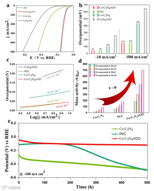 值得注意的是,Co-CNG具有与商业Pt/C相当的优异的HER性能,包括在低电位(47mV)下,达到了10mA cm-2的电流密度,优异的质量活性(Pt/C的4倍),对HER的长期耐久稳定性为500小时。