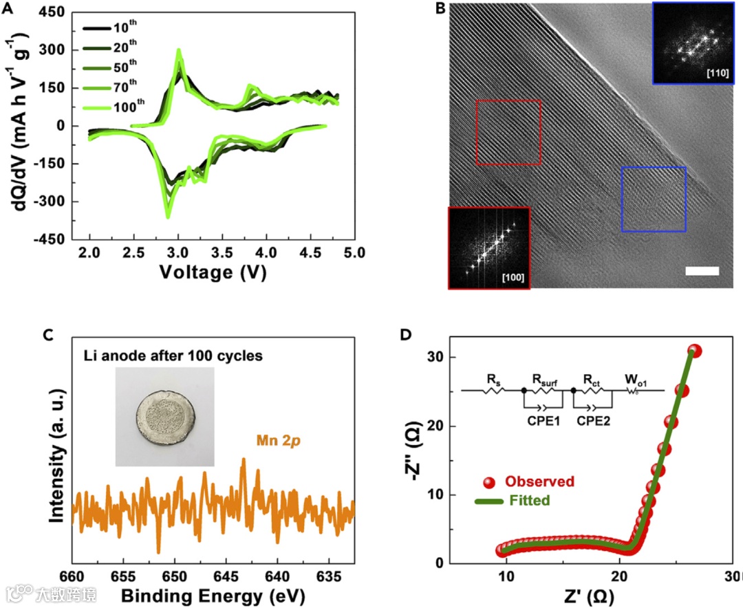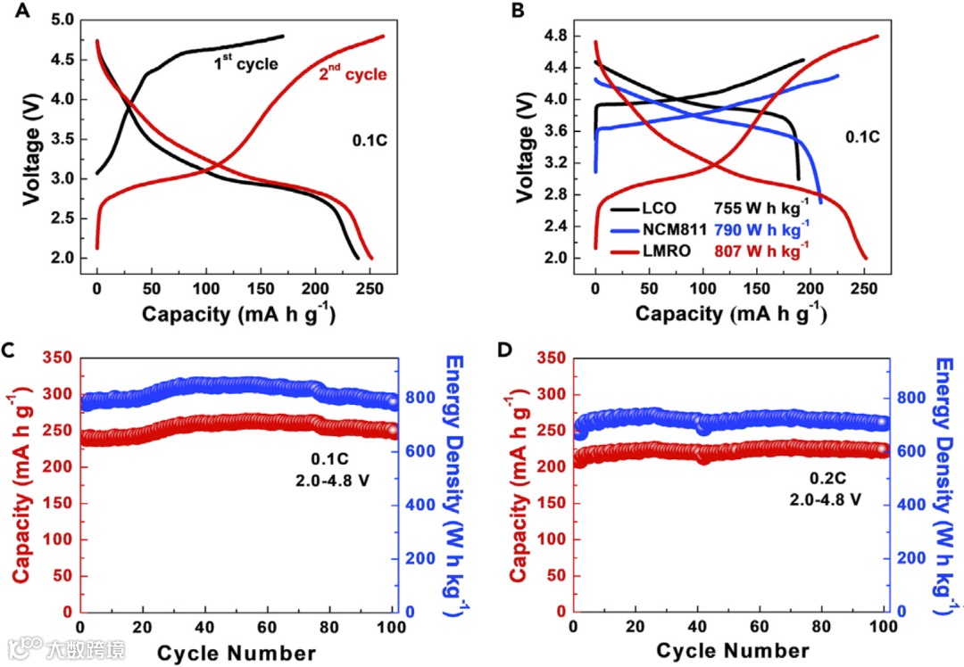 该工作报道了一种新型的富锰层状正极材料LMRO,其过渡金属层内具有离散分布的Li@Mn6超结构基元,这通过X-射线衍射 (XRD) 的超晶格峰和球差透射电镜的直接观察进行了验证 (图2)。电化学性能测试表明,LMRO在0.1C和0.2C (1C = 250 mA g-1) 倍率下长循环100圈后仍然保持较高的容量和能量密度 (0.1C和02C下分别为251 mA h g-1、791 W h kg-1和223 mA h g-1、707 W h kg-1),且没有明显的电压衰减 (图3)。