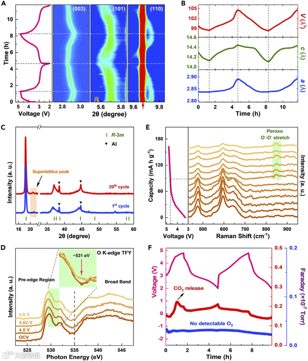 通过理论计算对比分析具有离散和局域富集分布的Li@Mn6超结构基元的两种富锰正极结构模型,作者发现在锂脱出后,离散的Li@Mn6超结构基元能够诱导更高的过渡金属迁移能垒和氧空位的形成能,验证了LMRO中Li@Mn6超结构基元的离散分布可以显著抑制过渡金属迁移和氧空位的形成,这进一步阐明了LMRO的构效关系 (图6)。