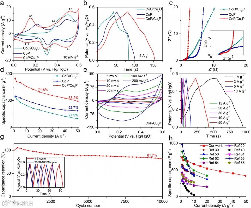 电化学测试结果表明,与金属氧化物(CoO/Cu2O)和单独CoP相比,CoP/Cu3P电极表现出增强的电化学性能。通过EIS分析也可以看出,CoP/Cu3P具有较低的电荷转移电阻和增强的反应动力学。CoP/Cu3P电极在电流密度为1.0 A g-1时的质量比容量达734.2 F g-1,当电流密度为20.0 A g-1时,容量保持71.8%;即使增加到50.0 A g-1时,容量仍保持53.2%,优于绝大部分报道的过渡金属氧化物和磷化物。