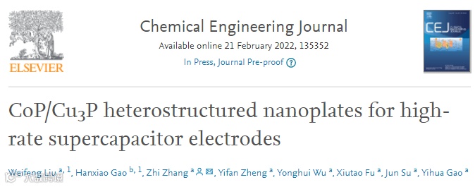 基于此,华中科技大学张智副教授(高义华教授团队),在国际知名期刊Chemical Engineering Journal上发表题为“CoP/Cu3P heterostructured nanoplates for high-rate supercapacitor electrodes”的观点文章。