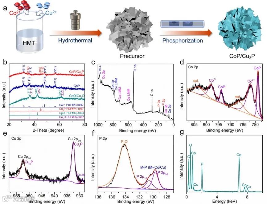 图1. CoP/Cu3P的制备以及XRD、XPS和EDS表征。