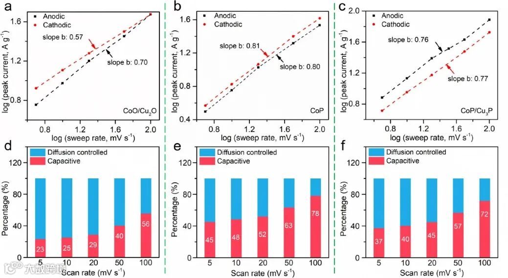 图四:电化学过程储能机理(a-c)和容量占比(d-f)分析。
