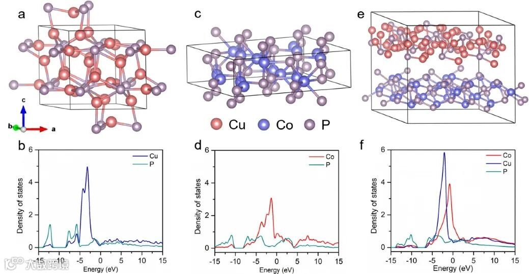 图5. CoO/Cu2O、CoP和CoP/Cu3P的结构表征及电子结构DFT计算。