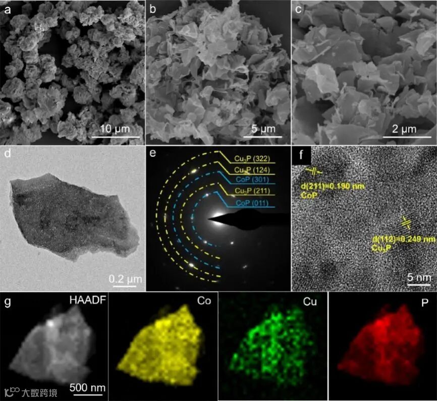 图2. (a-c) CoP/Cu3P在不同放大率下的SEM图;CoP/Cu3P纳米片的(d) TEM图, (e) SAED图,(f) HRTEM图像和 (g)元素 mapping图像。