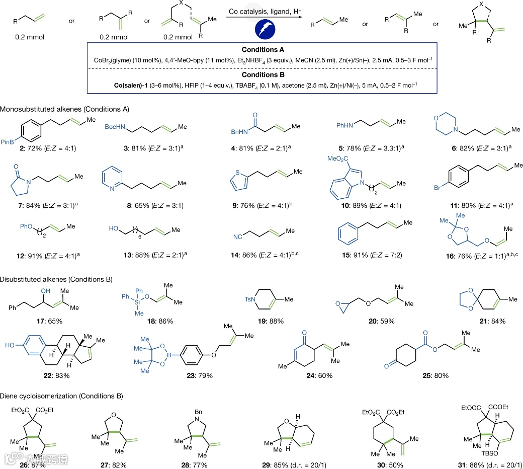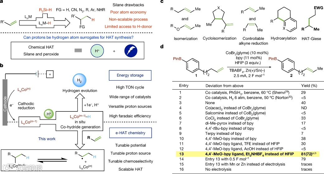 图1.储能启发的钴催化电化学HAT。a,经典的 HAT 化学。b,钴催化的 H2析出和 e-HAT。c,电化学驱动的 e-HAT 转换。d,烯烃异构化,与经典 HAT 方法的比较。