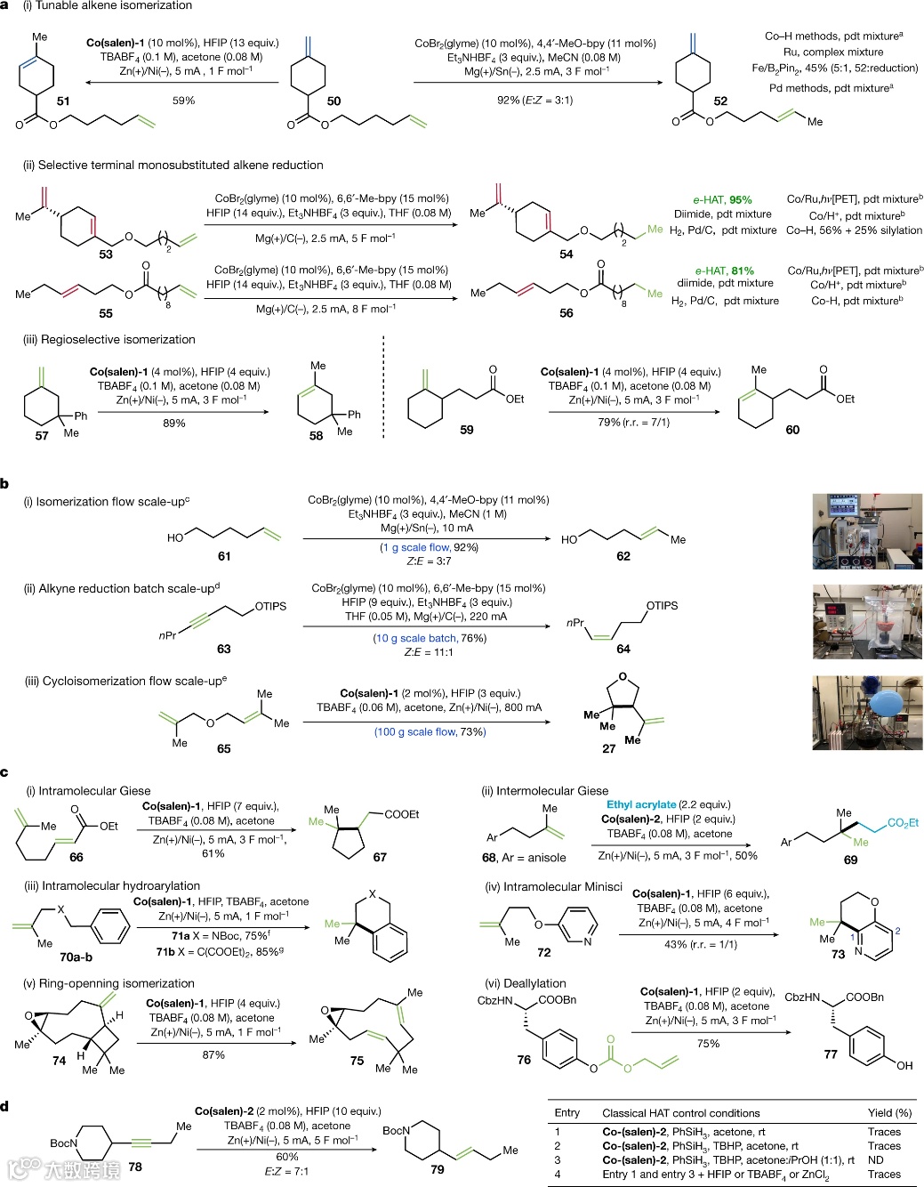 图 4. e-HAT 的选择性、可扩展性和 HAT 反应。a,烯烃异构化和还原的选择性。b,环异构化、异构化和还原 e-HAT 反应的流量放大后的结果。c,HAT 反应的通用条件。d,新的HAT反应:E-选择性炔烃半还原。
