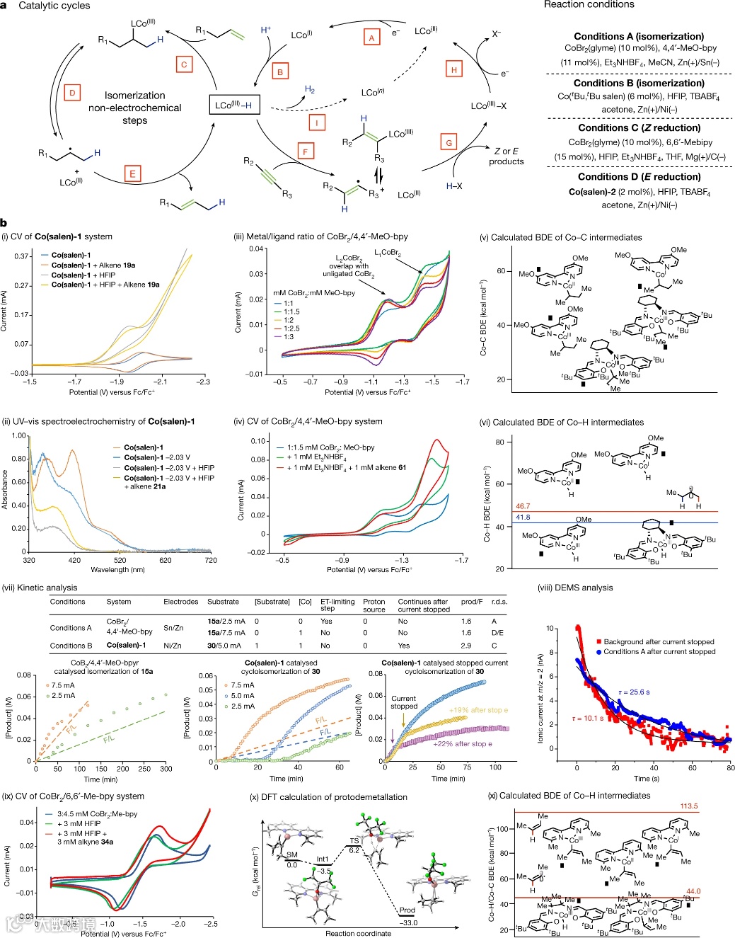 图 5.机理研究。a,所提出的e-HAT机理路径。b,使用循环伏安法 (CV)、UV–vis光电化学、动力学分析、微分电化学质谱法、键解离能 (BDE) 和 DFT 计算来验证机理。