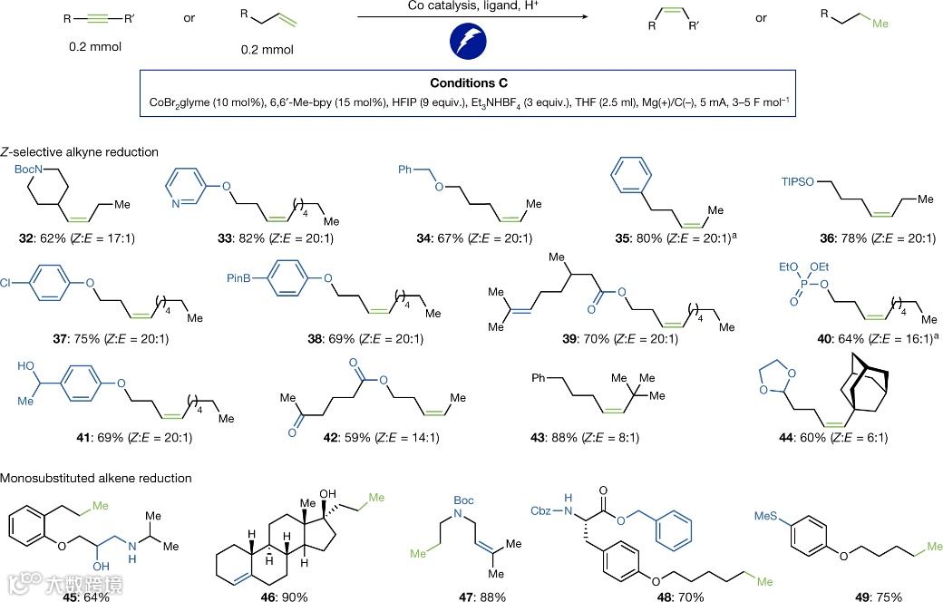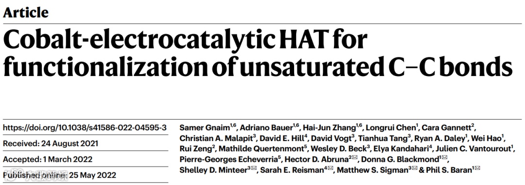 自1960 年代初以来,过渡金属氢化物 (TMH) 的研究和应用一直是化学研究中的活跃领域。该领域应用包括能量存储,质子还原产氢,以及有机合成(用于不饱和 C–C、C–O 和 C–N 键的功能化)。自 1950 年代以来,用于驱动反应的电化学方法已经很普遍,但在合成化学中使用化学计量的外源有机和金属还原剂来利用 TMH 仍然是常态。特别是,钴基 TMH 已广泛用于复杂分子结构中烯烃和炔烃的衍生化,通常是通过净氢原子转移 (HAT) 实现。在这里,作者展示了如何在现代有机合成的背景下,使用数十年储能研究启发的电催化方法来驱动有机合成反应。这种策略不仅在可持续性和效率方面提供了好处,而且还能够增强化学选择性和独特的、可调节的反应性。作者举例说明了跨越数十种底物的十种不同反应,以及基于Co-H 生成(通过低价中间体发生)的详细机理见解。