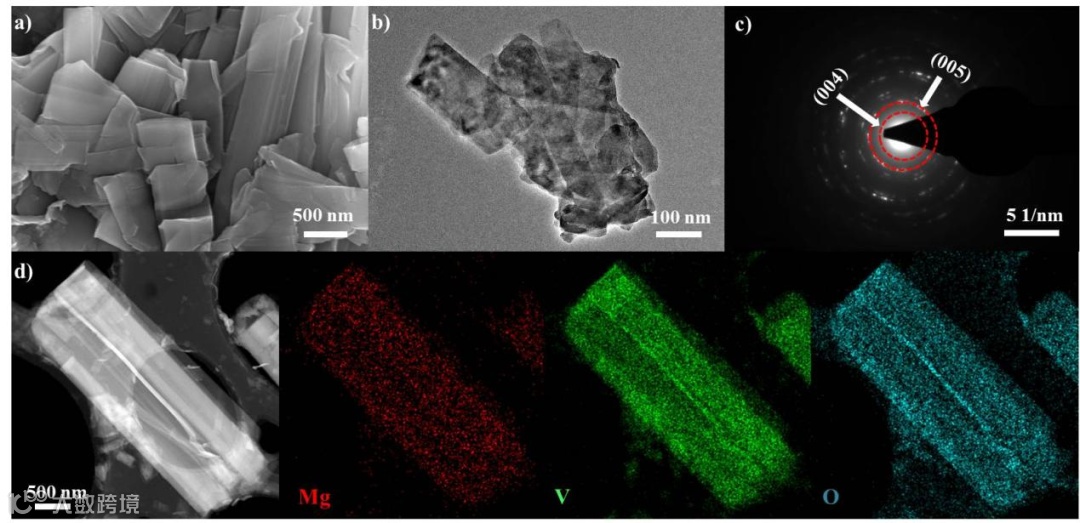 图1: Mg0.2V2O5·nH2O的(a)SEM,(b)TEM,(c)SAED,(d)TEM mapping图