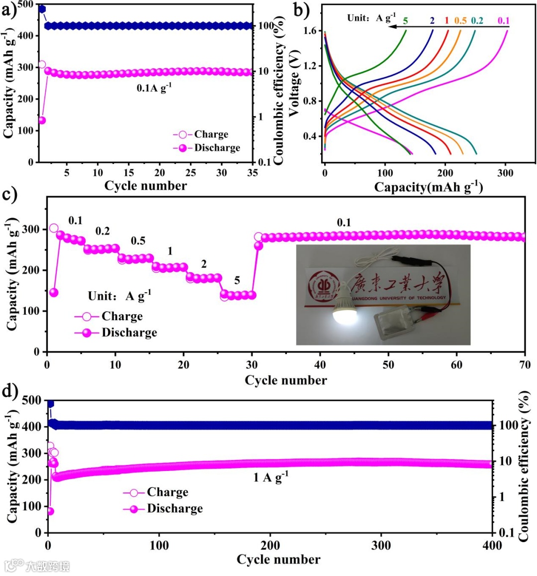 图3:软包电池在(a)0.1 A g-1电流密度下的循环性能,(b)电流密度为0.1-5 A g-1时的充放电曲线,(c)倍率性能和软包电池点亮灯泡图片,(d)1 A g-1电流密度下的循环性能