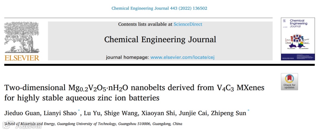 本文中,广东工业大学孙志鹏教授/邵涟漪特聘副教授团队在国际知名期刊Chemical Engineering Journal 上发表题为“Two-dimensional Mg0.2V2O5·nH2O Nanobelts Derived from V4C3 MXenes for Highly Stable Aqueous Zinc Ion Batteries”的文章,该文章通过水热法将V4C3 MXenes衍生为二维的V2O5,并在其层间进行了Mg2+和结构水的预嵌。以制得的Mg0.2V2O5·nH2O为正极,金属锌为负极组装扣式电池和软包电池均表现出高的比容量和稳定的循环性能。同时还使用了XRD,XPS,SEM和TEM多种表征手段对材料的储锌机制进行了深入的探究,并得出了可靠的结论。