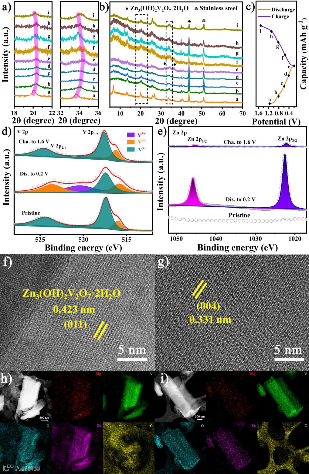 图2:Mg0.2V2O5·nH2O (a-c)非原位XRD图谱,(d,e)非原位XPS图谱,(f,h)首周放电状态下,(g,i)首周充电状态下的HRTEM和mapping图片