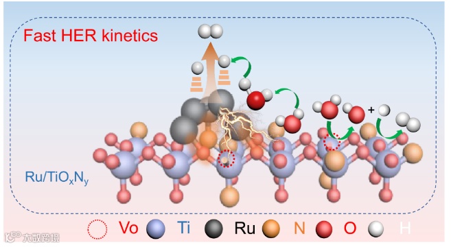 在碱性HER过程中,首先是催化剂吸附水分子,水分子在Ru/TiOxNy NBs的Ti位点上分解成H*和*OH中间体。然后,Ru-N键的形成促进了H*中间产物在Ru位点上重组成H2分子,并具有快速的HER动力学。