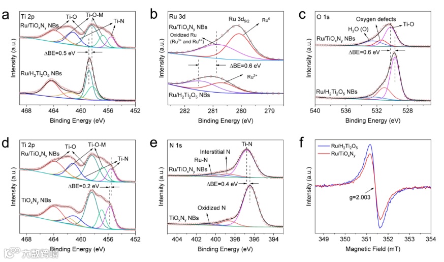 Fig. 3 Ru/H2Ti2O5和Ru/TiOxNy NBs的(a)Ti 2p,(b)Ru 3d,(c)O 1s能级的XPS光谱。Ru/TiOxNy 和TiOxNy NBs的(d)Ti 2p,(e)N 1s能级的XPS光谱。(f)Ru/H2Ti2O5和Ru/TiOxNy NBs的EPR图。
