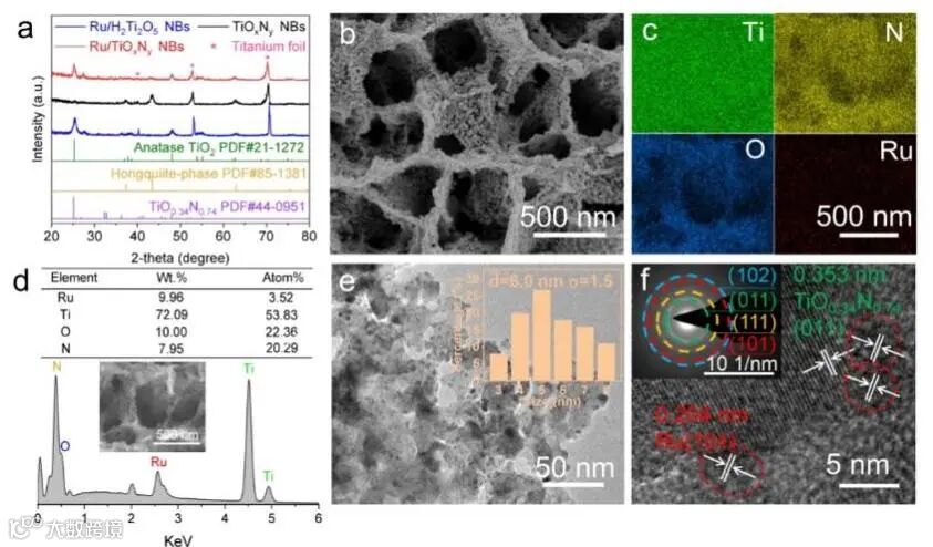 Fig. 2(a)TiOxNy, Ru/H2Ti2O5 and Ru/TiOxNy NBs的XRD图。Ru/TiOxNy NBs的(b)SEM图,(c,d)EDS图和元素含量,(e)TEM图,(f)高分辨TEM图和SAED图(插图)。
