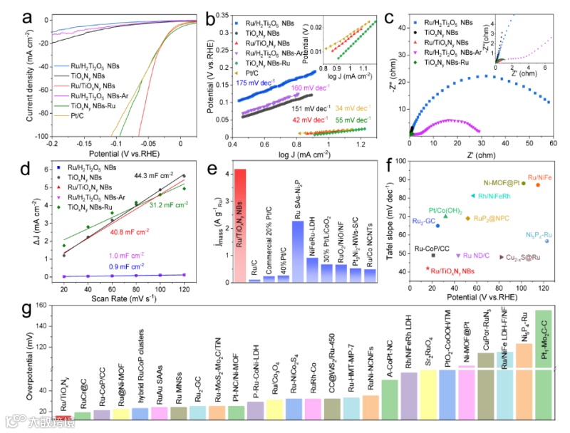 Fig. 4N2饱和的1 M KOH中测得的催化剂(a)极化曲线,(b)Tafel斜率,(c)EIS阻抗,(d)Cdl值。Ru/TiOxNy NBs与已报道的贵金属基催化剂的(e)质量活性,(f-g)Tafel斜率和过电势对比图。