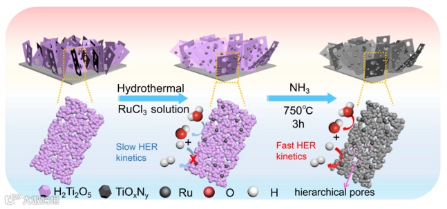 Fig. 1氨气中热处理Ru/H2Ti2O5合成具有多级孔的Ru/TiOxNy示意图,该材料具有快速HER动力学。