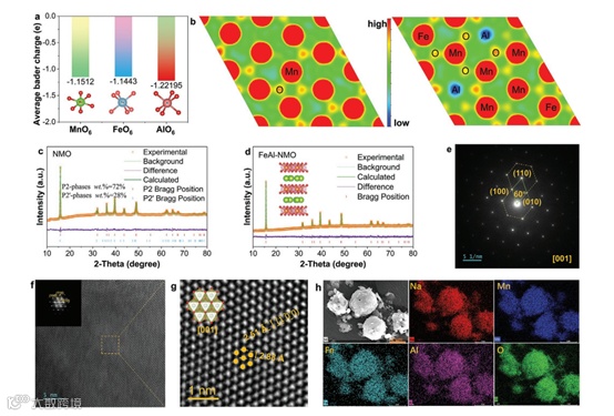 为了解决上述问题,北京理工大学赵永杰副教授和金海波教授设计了由Fe和Al共掺杂的Na2/3Mn2/3Fe1/6Al1/6层状正极。该正极材料明显抑制了Mn3+的Jahn-Teller效应,实现了阴阳离子协同氧化还原反应(Fe3+/Fe4+,O2-/(O2)n-),在20 mA g–1 循环时容量>170 mAh g-1。原位XRD和非原位TEM、XPS等结果表明材料在循环过程中结构稳定。