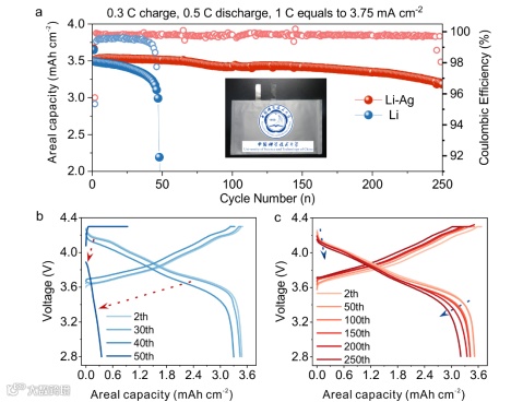 组装的Li20Ag||NCM-811袋式电池,面积容量为3.5 mAh cm–2,在经过250次循环后,容量保留率为87%,库仑效率为99.8% ± 0.1%。本研究的结果可能有助于设计锂基合金电极,以在二次电池中实现最佳性能。