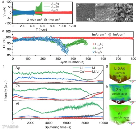 我们选择了三种基于二元相图的代表性锂基合金系统:一种是Li-Ag合金,具有富锂固溶相,延伸至锂金属;另一种是Li-Zn合金,具有极窄的锂原子浓度窗口的固溶相(49至50 at%,);最后一种是Li-Al合金,基本只包含金属间化合物相。三种合金的电化学性能和沉积行为有明显差异。其中固溶相的锂银合金实现了循环后均匀的元素分布并且有着优异的电化学性能。