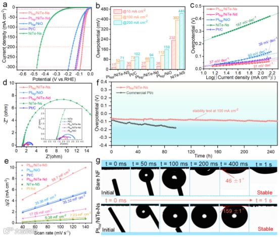 要点二:富含界面的PtNs/NiTe-Ns异质结催化剂含有大量的缺陷位点,电荷传输快,对反应中间体表现出最优的吸/脱附能力。此外,PtNs/NiTe-Ns的超亲水性和超疏气性促进了传质过程,保证了生成气泡的快速解吸,显著提高了整体碱水/咸水/海水电解的催化活性和稳定性。