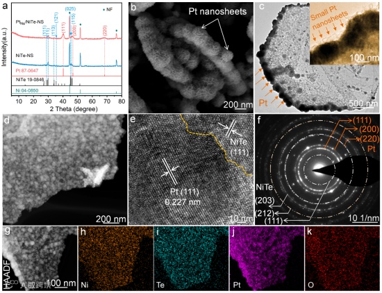 图2. PtNs/NiTe-Ns催化剂的晶体结构及微观形貌表征。