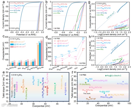 图5. PtNs/NiTe-Ns催化剂的酸性和中性介质中的HER电催化活性。