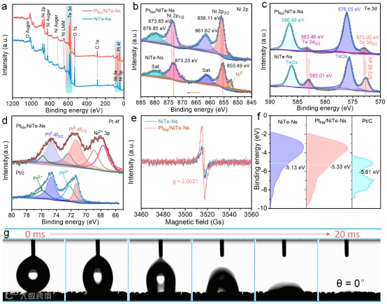图3. PtNs/NiTe-Ns催化剂的电子特性及表观超亲水和超疏气特性。