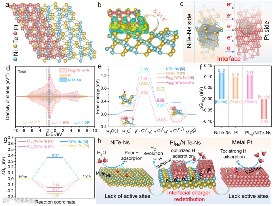 要点四:理论计算表明,金属Pt和NiTe-Ns的结合巧妙地调节了PtNs/NiTe-Ns界面上的电子再分布,改善了电荷转移动力学,提高了Ni活性位点的性能。PtNs/NiTe-Ns中Pt位点与界面附近活化Ni位点的协同作用促进了缓慢的水解离动力学,优化了随后的氢氧/氢中间体(OH*/H*)吸附,加速了HER过程。