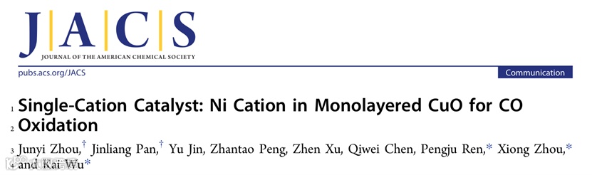 基于此,北京大学化学与分子工程学院的吴凯教授/周雄副研究员团队与中科合成油技术股份有限公司的任鹏举博士合作,在国际知名期刊JACS上发表题为“Single-Cation Catalyst: Ni Cation in Monolayered CuO for CO Oxidation”的文章。