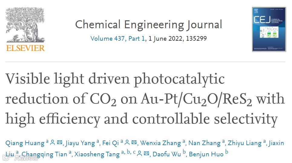 在这里,来自重庆邮电大学光电工程学院的黄强教授、戚飞博士、唐孝生教授,在国际知名期刊Chemical Engineering Journal上发表题为“Visible light driven photocatalytic reduction of CO2 on Au-Pt/Cu2O/ReS2 with high efficiency and controllable selectivity”的文章。