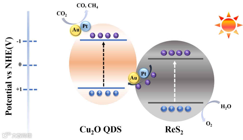 该研究先构筑了由零维Cu2O量子点与二维ReS2纳米片组成的新型异质结构,再双沉积Au、Pt纳米晶于Cu2O/ReS2异质结表面,获得的Au-Pt/Cu2O/ReS2复合光催化剂在可见光照射下应用于二氧化碳还原反应,不仅具有高的反应效率,而且反应产物的选择性精准可调。