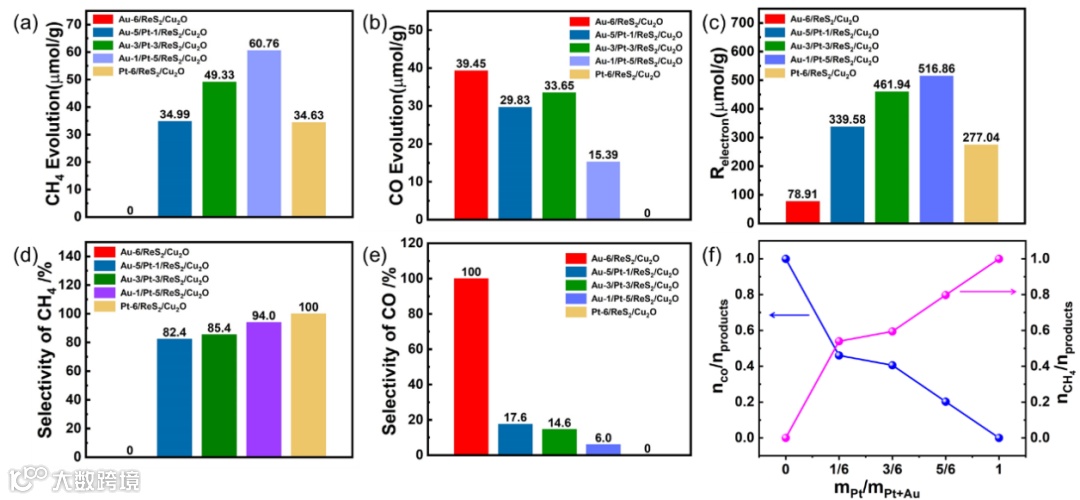单独沉积Au纳米晶在Cu2O/ReS2表面时,只生成CO产物;单独沉积Pt纳米晶时,只生成CH4产物;共同沉积Au和Pt时,同时生成CO和CH4产物,并且通过调节Au、Pt的质量比例,能够轻松实现CO和CH4的选择性从0到100%范围内的精准调控。