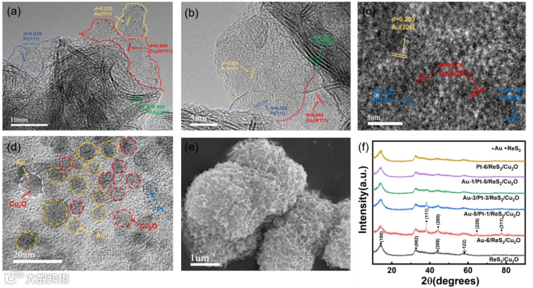图2 (a-d)Au-Pt/Cu2O/ReS2的TEM照片,(e)ReS2的SEM照片,(f)Au-Pt/Cu2O/ReS2 和Cu2O/ReS2的XRD衍射图。