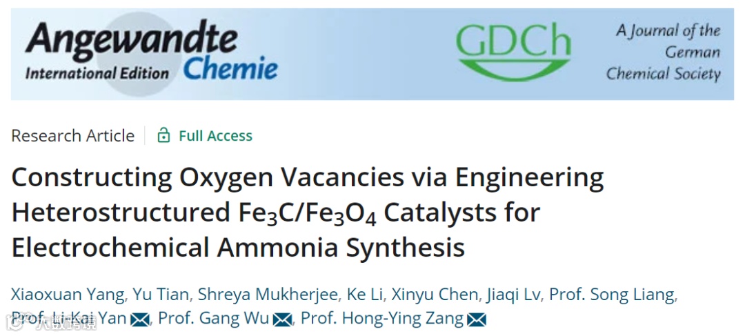 近日,来自东北师范大学的臧宏瑛教授、颜力凯教授与纽约州立大学布法罗分校的武刚教授合作,在国际知名期刊Angew. Chemie上发表题为”Constructing Oxygen Vacancies via Engineering Heterostructured Fe3C/Fe3O4 Catalysts for Electrochemical Ammonia Synthesis”的文章。该工作设计了一种独特的异质结诱导的原位氧空位构筑策略,详细阐明了缺陷和界面工程策略之间的相互作用,以最大程度地发挥电催化剂在电化学固氮中的优势。