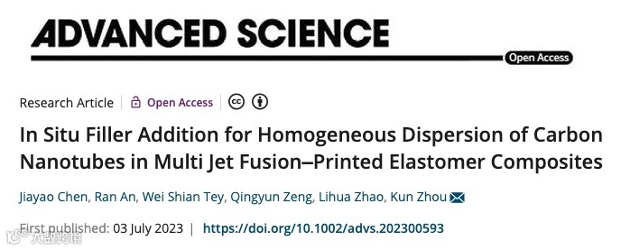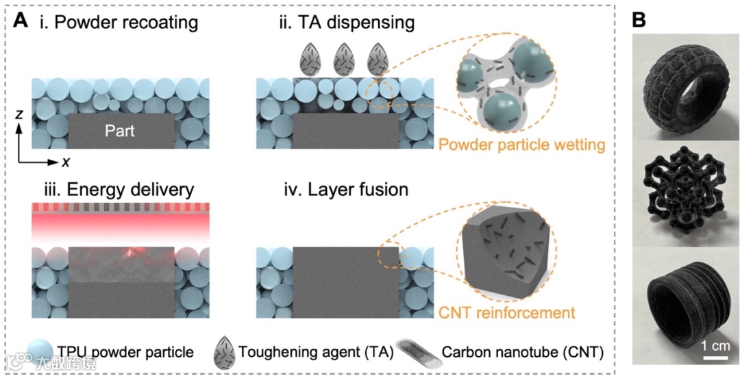 新加坡南洋理工大学周琨教授团队最近在《Advanced Science》期刊上发表题为“ In Situ Filler Addition for Homogeneous Dispersion of Carbon Nanotubes in Multi Jet Fusion–Printed Elastomer Composites”的文章(DOI: 10.1002/advs.202300593)。针对目前粉床式3D打印热塑性聚氨酯(TPU)制件的力学性能各向异性问题,本文作者基于惠普多射流熔融(Multi Jet Fusion, MJF)技术,提出了一类适用于该热发泡喷墨技术的增韧墨水(Toughening agent,TA),设计并优化其打印工艺,获得了力学性能增强、各向异性显著改善的碳纳米管(CNTs)增强TPU弹性体复合材料。如图1所示, 将含有CNTs的TA替代原有技术的助溶剂,通过设定程序可控地以细小液滴沉降于特定粉末床区域,经过液滴浸润粉末颗粒,CNTs均匀地分布在颗粒表面及缝隙,并在随后红外灯的照射下使粉末吸能熔融成型。
