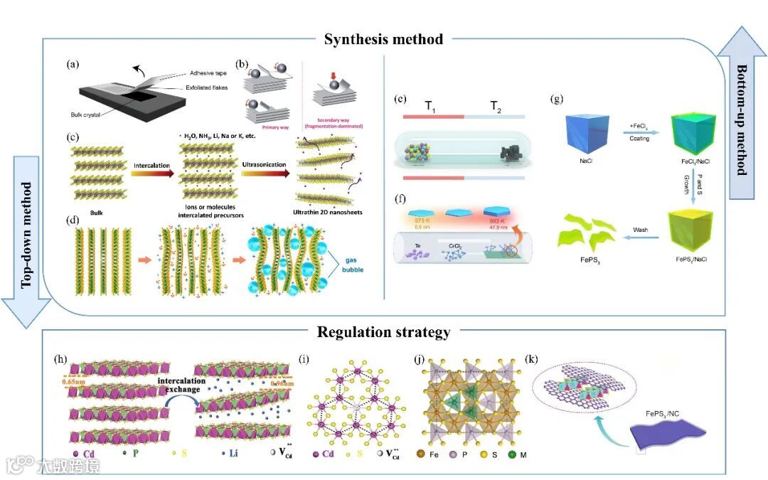高质量的材料制备是材料研究的关键。目前MPX3的合成方法大致可分为自上而下和自下而上两类。前者针对已有材料的微加工,如微机械和液体辅助剥离,这些方法能够制备具有优异结晶度和配置目标缺陷的单层或少层纳米片材料。后一种方法从原子或分子尺度开始,逐步组装材料的结构,从而便于在原子水平上进行精确控制。这使得我们能够创造出具有定制界面、纳米结构和多层结构的材料,包括化学气相传输、化学气相沉积等。